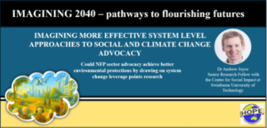 In this episode, Dr Andrew Joyce shares insights from his extensive experience in social policy, public health, and systems evaluation, exploring how systems thinking and political science can support transformative change. Drawing on the influential work of Donella Meadows and the evolution of the Intervention Level Framework concept, we discuss how strategic advocacy targeting specific leverage points within systems could drive more impactful climate and social policy reform. The conversation includes findings from Dr Joyce and colleagues’ 2023 research, which examines how climate advocacy groups in Australia could enhance their effectiveness by aligning their demands with higher-leverage intervention points. The episode concludes by reflecting on how this approach could empower environmental and social movements to better tackle climate disruption, biodiversity loss, and public health challenges through to 2040 and beyond.